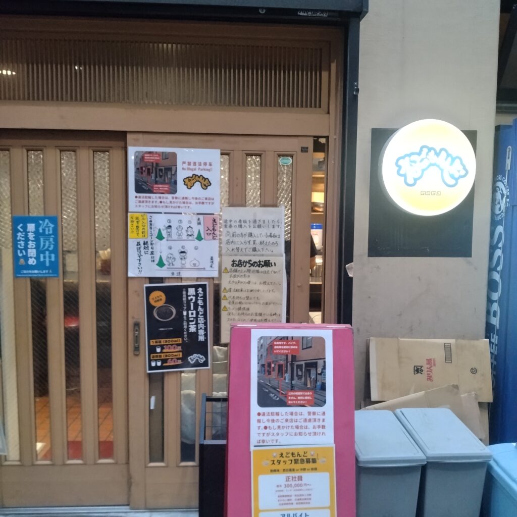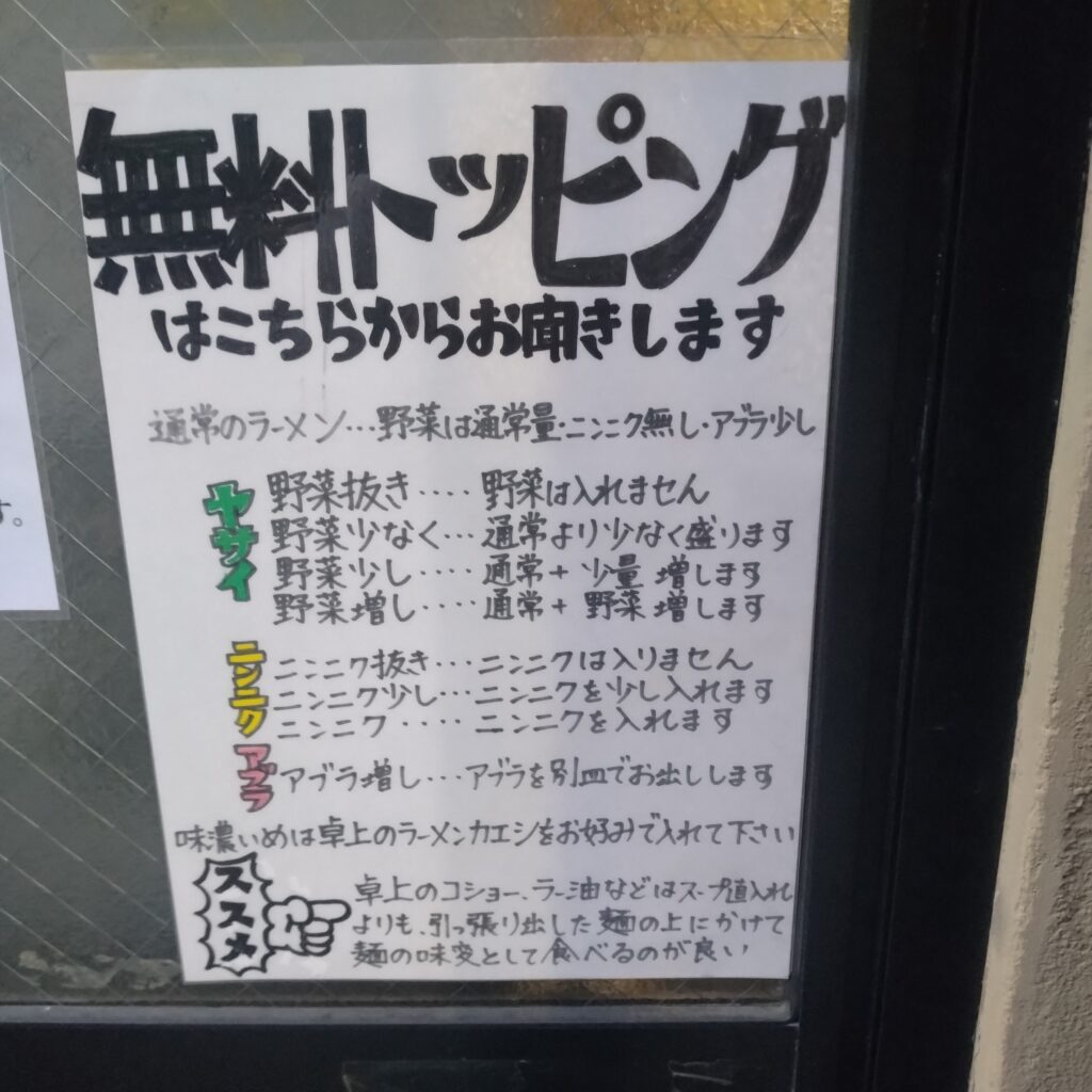 入口には「冷房中」「無料トッピングはこちらからお申し付けください」といった貼り紙がぎっしり。店の外観はシンプルながらも、初めてでも分かりやすく案内が整っており、常連客への心配りが感じられます。