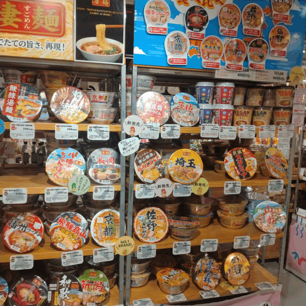 まず目を引くのが、壁一面に並んだご当地インスタントラーメンの棚。