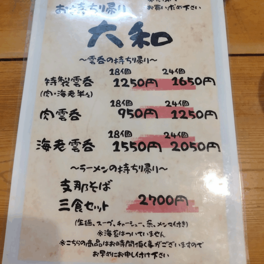 メニューを見ると、「特製雲呑(肉・海老半々)」「肉雲呑」「海老雲呑」と選べるお持ち帰りセットも充実。18個入り・24個入りから選べて、自宅でゆっくり楽しむことも可能です。