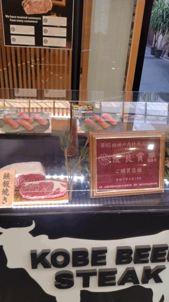 ショーケースには、高級感のある神戸牛や霜降りの美しい肉がズラリ。