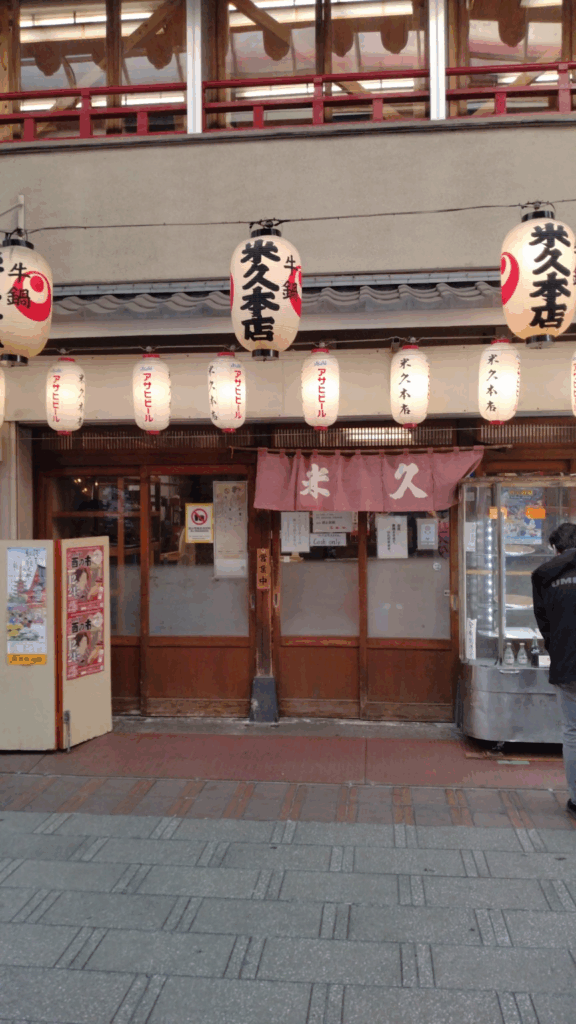 As you walk deeper into the street, you’ll come across Yonekyu Honten, a famous beef hotpot restaurant marked by a row of red lanterns.