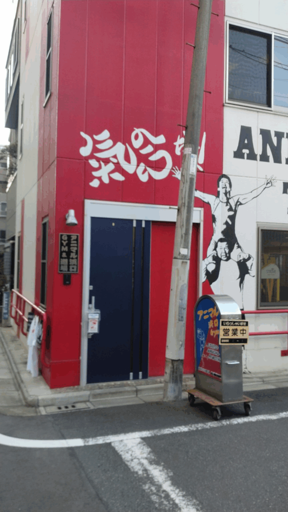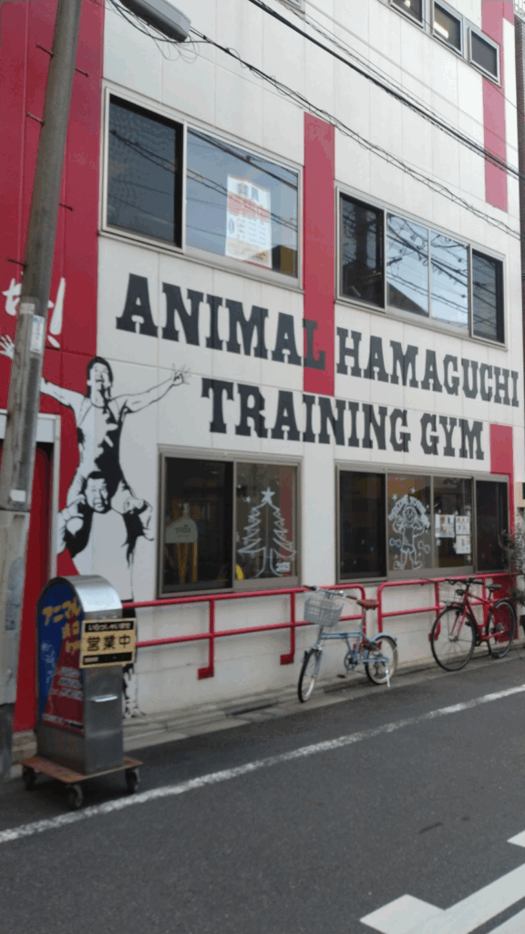 Once you exit Hisago Street and slip into a smaller side road, a striking building immediately catches your eye — a vivid red exterior boldly marked with the words “ANIMAL HAMAGUCHI TRAINING GYM.”